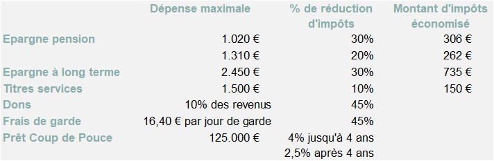 Gabin a également placé le montant de 2.450 € (max. suivant ses revenus) dans l'épargne à long terme. Il obtient une réduction d'impôts de 30%.
